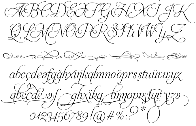 Font həmçinin ornament əlavələri ilə gəlməkdədir, ətraflı məlumatı bu .pdf faylından tapa bilərsiniz.