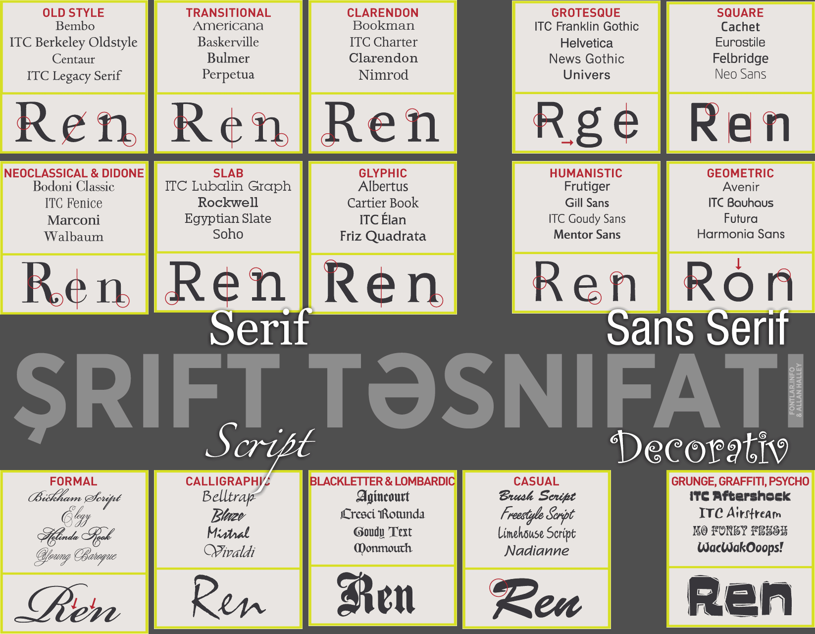 Bu infografik Niderlandlı tələbə Julian Hansen tərəfindən hazırlanıb. Fontlara səhifə-səhifə baxmaqdansa, müəyyən bir proyekt üçün font seçməyin alternativ yolunu təqdim edir. Burada Font Shop tərəfindən 100 Besten Schriften siyahısındakı 50 ən yaxşı font göstərilmişdir.